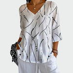 Бялата блузка с черни ивици и точки е перфектната комбинация от простота и елегантност. V-образното деколте добавя женственост, докато удобният материал я прави идеална за ежедневна употреба, но и за по-софистицирани поводи.