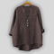 Лека ленена блуза, която комбинира удобство и стил. Има V-образно деколте с три копчета и дълги ръкави, които могат да се навиват, създавайки неформален, но елегантен вид. По-дългият заден край предлага модерен силует, идеален за ежедневни и неформални комбинации.