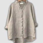 Елегантна ленена блуза, която съчетава простота и вечен стил. V-образно деколте с деликатна воланка добавя женствен детайл, докато свободният крой осигурява комфорт през целия ден. Асиметричният край с по-дълга задна част прави модерен, но елегантен избор за всеки повод.