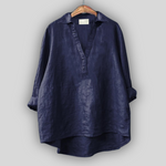 Елегантна ленена блуза в бяло, която излъчва свежест и вечен стил. Има V-изрез с дискретно закопчаване, дълги ръкави, които могат да се навиват, и асиметричен край с по-дълга задна част, осигуряваща комфорт и лекота на движението. Идеалният избор за стилни летни комбинации или елегантен ежедневен вид.