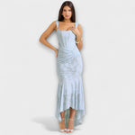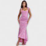 Тази прекрасна дълга рокля в мека лилава цветова комбинация съчетава елегантност и женственост, с романтични детайли и кройка, която обгръща тялото. Корсетът с драпирания дизайн подчертава талията, докато асиметричната пола добавя движение и грация на всяка ваша стъпка.