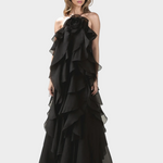 Тази прекрасна дълга рокля в топъл кафяв нюанс излъчва лукс и романтика. Дизайнирана с многостепенни волани от лека и прозрачна тъкан, създава впечатляващо движение при всяка ваша крачка.