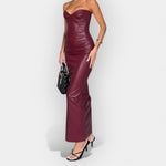 Тази рокля се отличава със своята смела характеристика и луксозна текстура на кожата. Идеална за изразителни появи, комбинира елегантност и динамика във всяка своя линия.