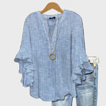 Подобрете класическия си стил с тази тениска в син цвят с вертикални бели ивици. Нейният минималистичен дизайн съчетава елегантност и практичност, докато ръкавите с волани добавят женственост и движение. Идеална е за ежедневни визии, но и за по-формални поводи.
