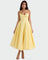 Зашеметяваща миди рокля в светло жълт цвят, която излъчва елегантност и женственост. Корсетният дизайн на горната част подчертава деколтето с фин детайл, докато богатата A-образна линия на полата осигурява движение и романтично настроение. Идеална за летни излизания, вечерни събития и специални поводи.