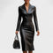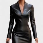 Тази тясна рокля от изкуствена кожа е перфектният избор за жени, които искат да подчертаят своята увереност и изтънченост. Модерният крой, който следва линията на тялото, акцентира на фигурата, докато материалът с висок блясък придава смел и луксозен вид. Идеална е за вечерни излизания, специални събития или моменти, когато искате да оставите силно впечатление.