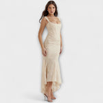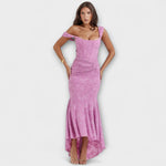Тази прекрасна дълга рокля в мека лилава цветова комбинация съчетава елегантност и женственост, с романтични детайли и кройка, която обгръща тялото. Корсетът с драпирания дизайн подчертава талията, докато асиметричната пола добавя движение и грация на всяка ваша стъпка.