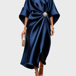 Излъчваща лукс и вечна елегантност, тази сатенена рокля е епитом на финеса. Нейният уникален крой в комбинация с декоративната катарама подчертава силуета с дискретен блясък.