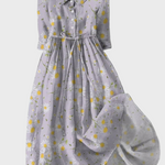 Тази очарователна дълга рокля в нежно лилаво е идеалният избор за свеж и пролетен вид. Нейната дискретна схема с бели и жълти цветя придава уютна и весела атмосфера, докато коланът в талията осигурява перфектно прилягане.