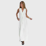 Тази изискана макси рокля излъчва простота и финес. Без ръкави и с V-образно деколте, предлага ласкава силуета, докато свободният крой позволява свобода на движението и комфорт. Идеална е за вечерни поводи, специални събития или елегантни летни комбинации – парче, което никога не излиза от мода.