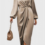 Влезте в елегантността на нощта с Андреа, рокля с течащ силует, проектирана да подчертае и очарова. С дълбок V-изрез, меки надути ръкави и набръчкан пояс, който акцентира на фигурата, Андреа носи sophistication с всяко движение. Страничният разрез добавя модерен и съблазнителен нюанс, идеален за нощи, които изискват незабравим стил.