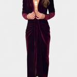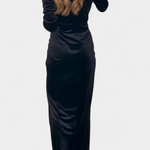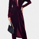Очарователна силуетка, която комбинира сексуалност и вечна елегантност. Вилма се отличава с дълбок V-изрез, който удължава фигурата, дълги ръкави, които балансират дизайна, и преден разрез, който добавя динамика и смелост. Златният завършек усилва нейния магнитен характер, правейки я парче, замислено да блести на всяка възможност.