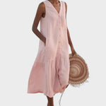 Тази елегантна рокля без ръкави е перфектната комбинация от комфорт и стил. Проектирана с V-изряз и копчета отпред, роклята предлага небрежен, но изискан вид. Проветливият крой позволява свобода на движението, докато практичните джобове добавят функционалност. Идеална е за дневни разходки, почивки или неформални срещи.