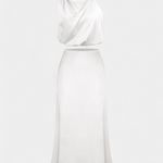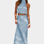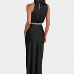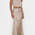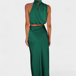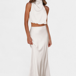 Ярка и запомняща се, тази комбинация от пола е проектирана да се откроява с драпирания си топ с халтер изрез, деликатни детайли и силует, който елегантно се движи. Осигурява леко и изискано усещане, което прекрасно се движи с теб.