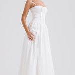 Елегантна цветна рокля, която подчертава женствеността с романтичен нюанс. Пригоденият корсет с вертикални шевове акцентира на силуета, докато широката пола осигурява комфорт и движение. Идеална за пролетни и летни поводи, от ежедневни разходки до елегантни покани.