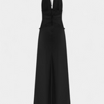 - Дълбок халтер изрез, който стилизира и подчертава деколтето с елегантност