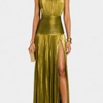 Скулптурен гламур с магнитна енергия. Роклята Хана впечатлява с металния си завършек в нюанс перидот и силует, който тече с мощ и елегантност. Нейният дефиниран халтер изрез, откритите гърба и акцентирания разрез създават перфектен баланс между структура и движение.