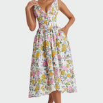 Женствена и елегантна рокля с цветен десен, която излъчва романтика. Персонализиран корсет и ефирна миди пола създават силует, който подхожда на всякаква форма на тялото. Идеална за летни излизания, сватби и специални поводи.
