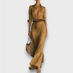 Тази рокля с колан в талията е перфектният избор за жени, които искат да подчертаят фигурата си и в същото време да запазят изискан стил. Летящият крой осигурява лекота и свобода на движението, докато коланът в талията визуално оформя силуета. Идеална е за летни разходки, вечерни излизания или специални поводи, когато искате да блеснете.