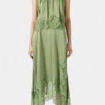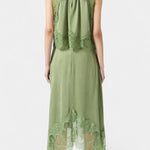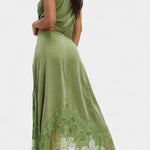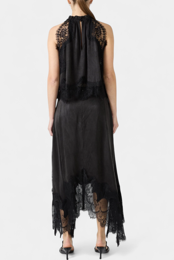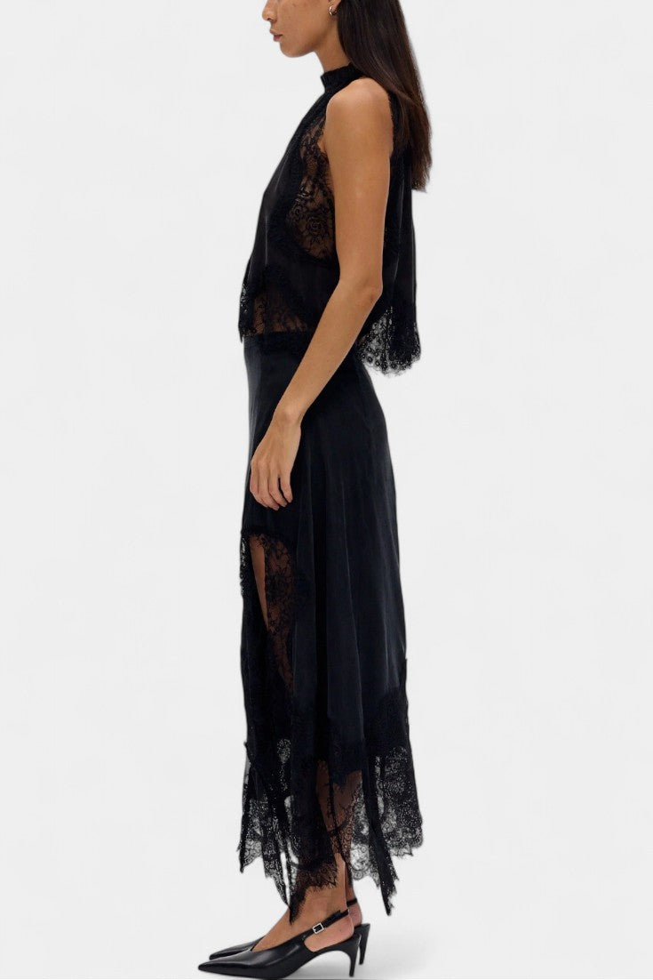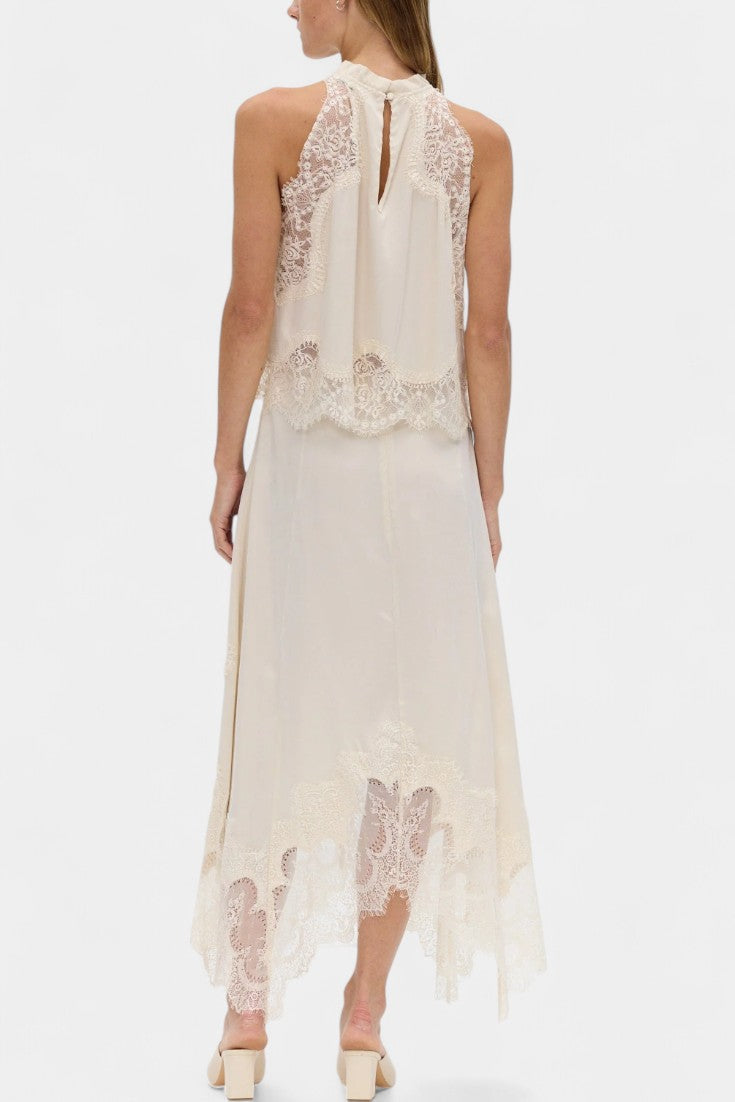 Комплект, който излъчва движение, свежест и безвременна изисканост. Нада комбинира миди пола с деликатни дантелени панели и асиметричен подгъв, който придава флуидност на всяка стъпка, с подходящ топ, който балансира елегантността и модерността.