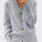 Мек, приятно-пухкав кардиган със свободна линия и V-образно деколте, завършен с релефни рипсени маншети и подгъв. Акцентът са ефектните копчета във форма на сърца, които придават характер и завършеност на визията. Дължината до ханша и леко спуснатото рамо осигуряват комфорт и лесно наслояване върху любими топове, ризи или рокли – от офиса до уикенда.