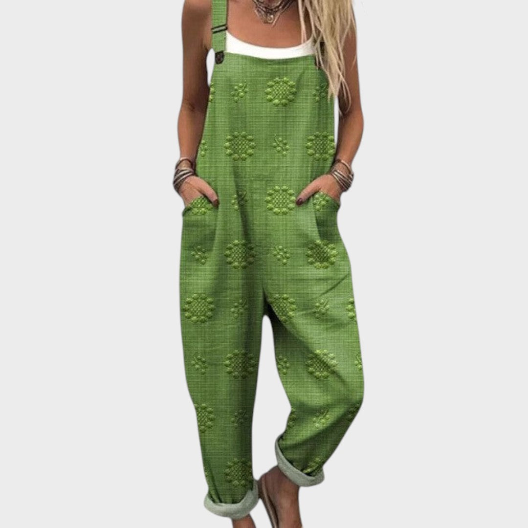 Този лек гащеризон съчетава комфорт и уникален дизайн в парче облекло, което ще обожавате да носите всеки ден. С широк силует, практични джобове и игриви детайли, той е перфектен за разходки, излети или релаксиращи моменти у дома.