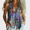 Изразете своята артистична страна на стила с този без ръкави топ в лилав нюанс, украсен с абстрактни геометрични мотиви в ярки цветове. Дизайнът с копчета предлага практичност и елегантност, докато свободният крой предлага комфорт за ежедневни и летни комбинации.