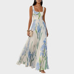 Дълга рокля, която съчетава романтика и изтънченост. Квадратен деколте с широки презрамки, който със сигурност подчертава деколтето, дефинираната талия оформя фигурата, а плисираната пола придава плавно падане, което следва всяка стъпка. Изработена от лека, еластична материя за целодневен комфорт, с ботанически мотив, който внася свеж, шикозен вид. Идеална за сватби, вечери, пътувания и събития на открито — визията е готова с сандали и клъч чанта.
