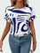Тениска с къс ръкав в бяло с сини абстрактни геометрични шарки предлага модерен и свеж стил. Нейният свободен крой прави я идеална за ежедневни комбинации, докато може да се носи както с дънки, така и с поли за по-елегантни опции.