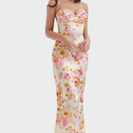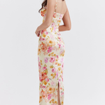 Импозантна макси рокля с цветен десен, която излъчва женственост и елегантност. Нейното тясно кроене подчертава силуета, докато деколтето с тънки презрамки придава усещане за деликатна привлекателност. Парче, което комбинира романтика и лукс, идеално за специални поводи.